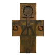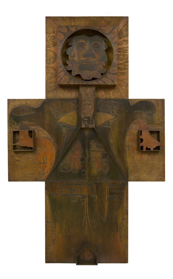 Colombino's work marks the climax of the Paraguayan plastic arts' entry into contemporary modern art. He has traveled to and studied in Paris and Madrid, but a powerful connection with Paraguay lured him home where he currently resides. Throughout his long career, Colombino has produced a coherent and powerful body of work. His accomplishments include Inter-American Award Gabriela Mistral in Washington D.C., Special Prize for Painting at the Bienal Internacional del Deporte in Madrid, Spain, International Prize for Engraving at Bienal de San Juan de Puerto Rico, and first prize at the Sao Paulo Bienal in Sao Paulo, Brazil. His work has been featured in numerous solo and group exhibitions, and continues to be a strong presence in the Latin American art community. Wood contains a movement that is present within the grain; it is this flow pattern that inspires Carlos Colombino when he carves into a slab of this material in order to generate a form. Later in his artistic endeavor, he adds minimal color to areas that highlight geometric monumental forms that originate from the depths of the imagination. The results are shapes and images that take on a life and reality of their own and which exist in a surreal environment that was created especially for them to thrive. Political and social themes also purvey here. Human rights confront dictatorship as his shapes are woven together but on the verge of falling apart, straining against one another.