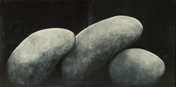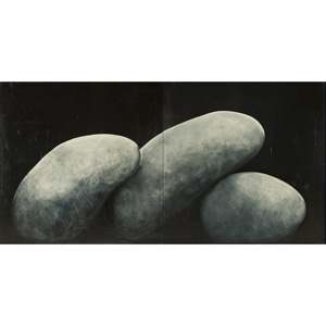 The stones, those round basalt pebbles found on the beaches in Madeira, are this artist’s favourite subject, which she paints on extremely large canvases.